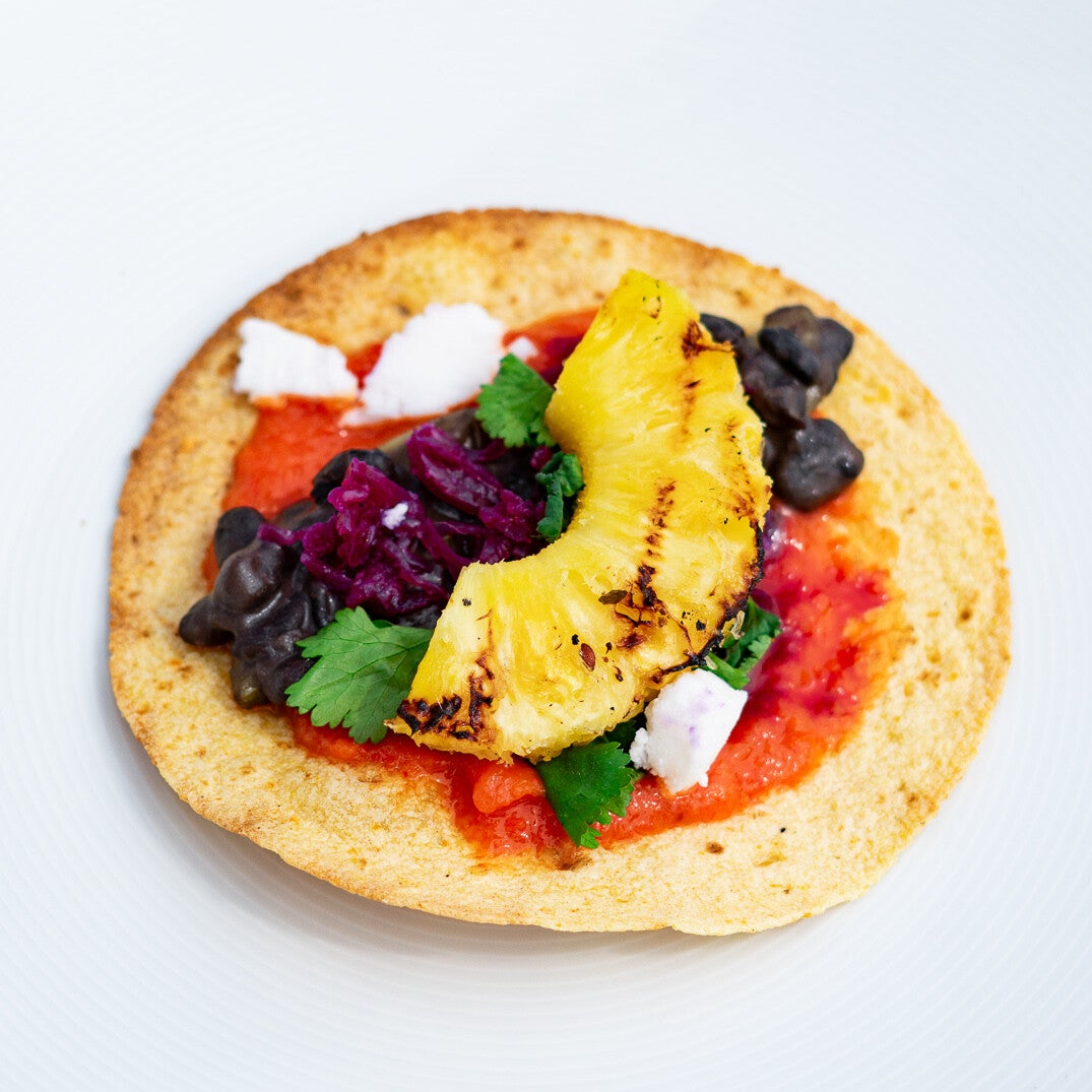Serveer de tortilla met de paprikasaus, rokerige bonen, rode zuurkool, nog wat kruimels vegan feta, gegrilde ananas en koriander. Voilà